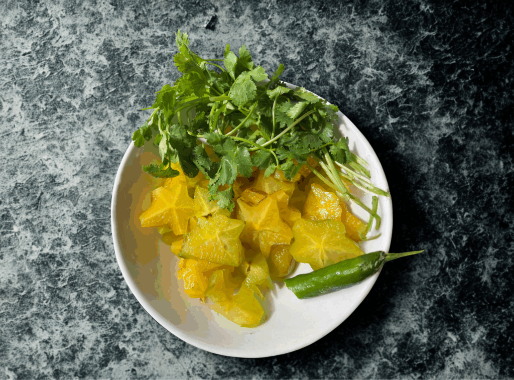 Crushing the cilantro and green chili by hand (or blending lightly) releases essential oils that taste brighter and more aromatic than chopped herbs. When mixed with the star fruit, this green paste clings to the slices, giving every bite flavor without masking the fruit’s natural crispness.